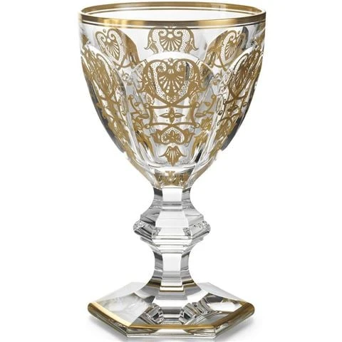 Celebrated for its elaborate design, Harcourt stemware has been in the hands of power throughout the ages. The Harcourt Empire glass shares the same structural outline as the original vessel with the addition of exquisite golden embellishment. The flat cut pattern of the bowl has golden decorative shapes applied with a light hand, and a gilded rim. The geometric bevelled stem remains classical, while the hexagonal foot is also gold-trimmed. The glass sparkles luxuriously with both lucid crystal and gold.