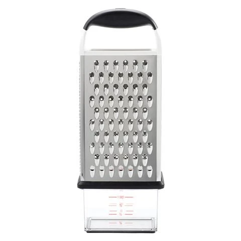 Oxo’s Good Grips Box Grater features four stainless steel surfaces – two wide ones for coarse and medium grating and two slimmer ones for fine grating and slicing. A convenient container with non-slip base, measurement markings and lid attaches to the bottom for catching and storing freshly grated ingredients.